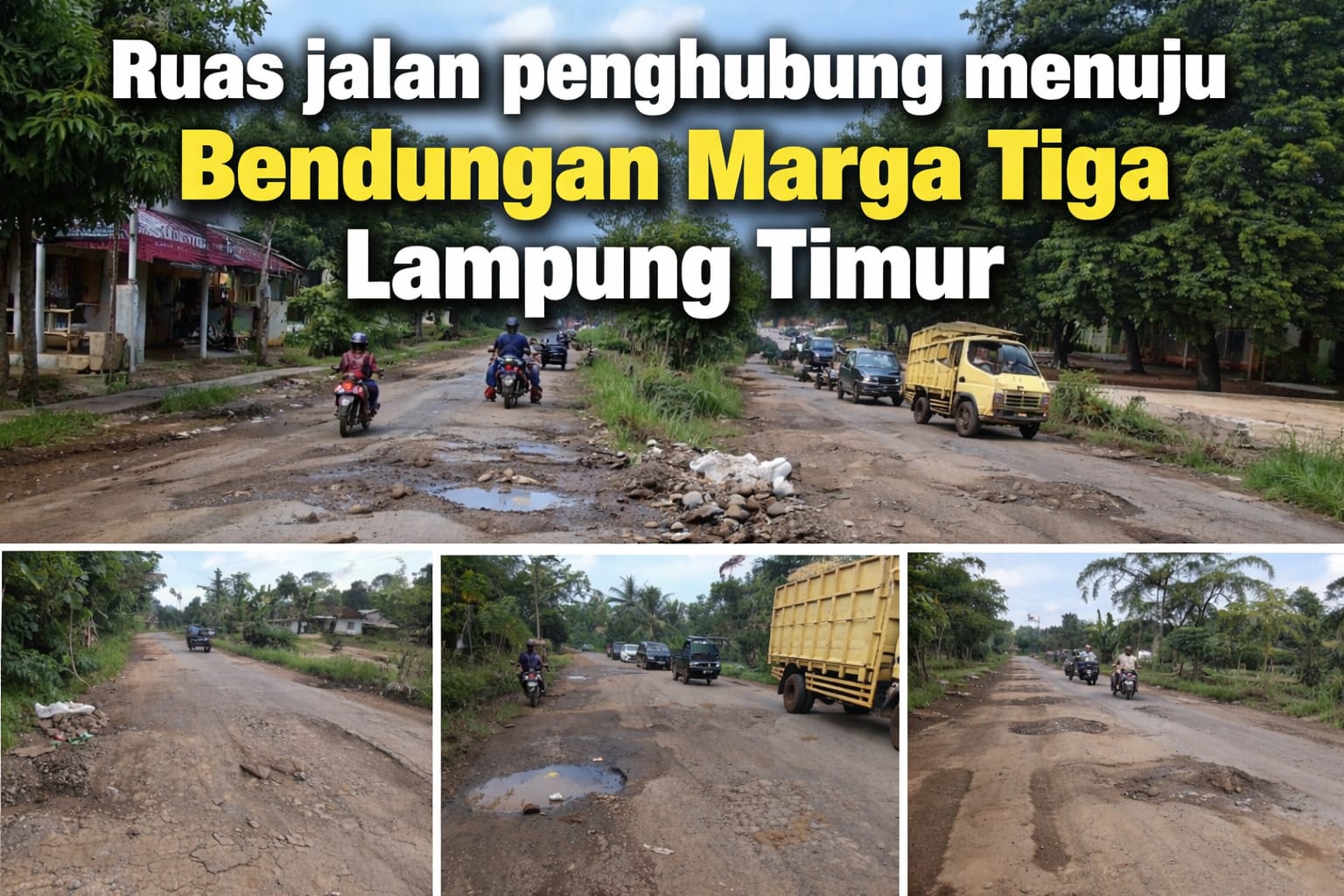 Pantauan di lokasi, kamis, 16/4/2026, Saat hujan, lubang tersebut tergenang air .Jalan ini bukan jalan biasa. Ruas Nyampir–Tanjung Harapan merupakan jalur utama menuju Bendungan Marga Tiga, proyek strategis nasional yang diresmikan Presiden Joko Widodo pada 2024. Setiap hari, jalan tersebut menjadi urat nadi ekonomi warga untuk distribusi hasil bumi dari Lampung Timur.